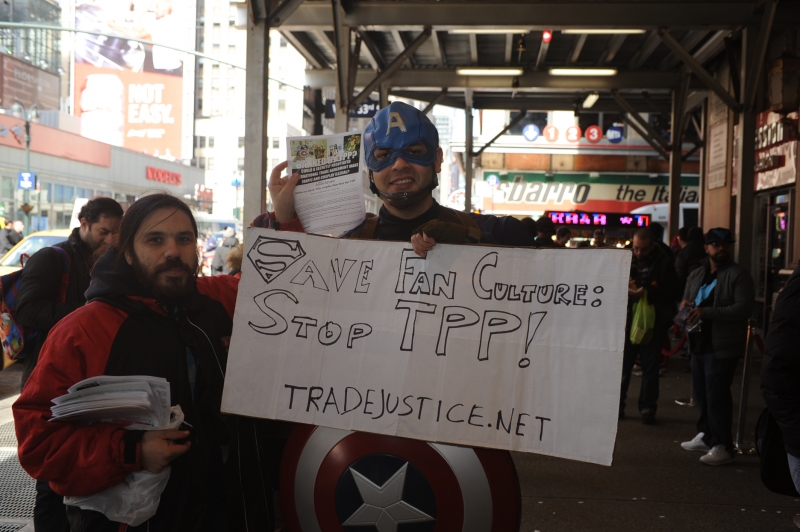 On Saturday, March 5th, TradeJustice activists leafletted at the Big Apple Convention, a comic book and pop culture show at the Penn Plaza Pavillion across the street from Penn Station on 7th Avenue. Our objective was to in warn fans that TPP's intellectual property rules threaten to criminalize popular fan hobbies including: