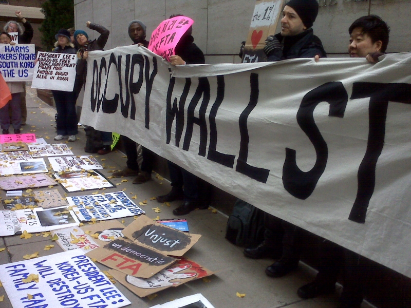 TradeJustice Activists, Korean Americans for Fair Trade, and Occupy Wall Street Protest at Korean Consulate on Day of FTA Vote in Korean Parliament