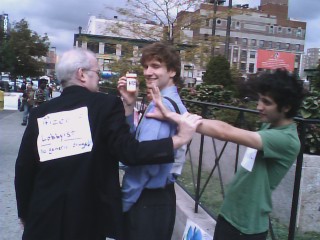 The crowd of about 13 protestors included Rangel constituents and members of Wetlands Activism Collective, the Movement for Peace in Colombia, Global Justice for Animals, the New York Committee in Solidarity with the People of El Salvador, Health GAP (Global Access Project), Polo Democratico Alternativo USA (NY/NJ/CT chapter), and Cowboys Against Bush. Media on hand included Bill Moyer's Journal and the Amersterdam News, a NYC African American newspaper.